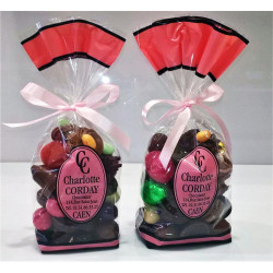 Disponible en chocolat noir à 68% de cacao minimum ou au chocolat au lait à 37% de cacao minimum.